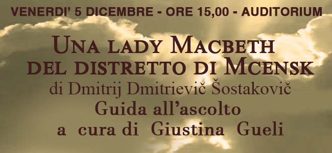 VENERDI’ 5 DICEMBRE – ORE 15,00 – AUDITORIUM Una Lady Macbeth del distretto di MCenskArte e Potere all’ombra di Stalin di Dmitrij Dmitrievič Šostakovič Guida all’ascolto a cura di Giustina Gueli