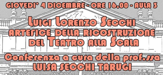 GIOVEDI’ 4 DICEMBRE – ORE 16,00 – AULA 3 LUIGI LORENZO SECCHI ARTEFICE DELLA RICOSTRUZIONE DEL TEATRO ALLA SCALA Conferenza a cura della prof.ssaLUISA SECCHI TARUGIGli iscritti all’università potranno seguire anche nella modalità online